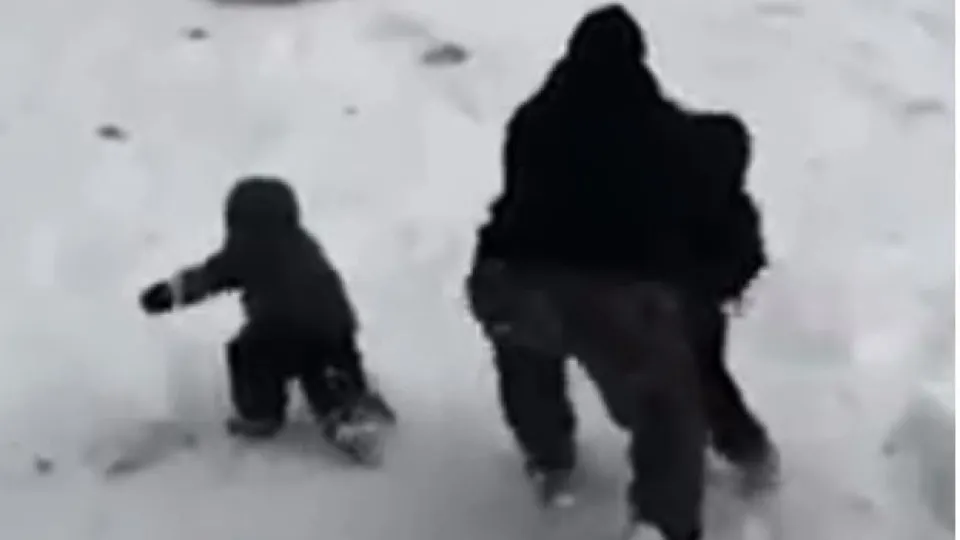 As imagens impressionantes foram divulgadas nas redes sociais e mostram duas crianças a caminhar na neve quando outra criança, montada num trenó, desce a encosta. Colisão parecia inevitável.